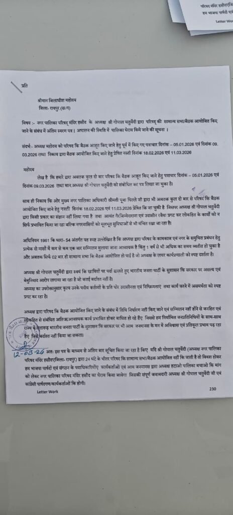 मामले को गंभीरता से लेते हुए भाजपा पार्षदों ने नगरवासियों के हित में कड़ा रुख अपनाया और संचालक नगरीय प्रशासन विभाग नवा रायपुर, जिला कलेक्टर रायपुर तथा थाना मंदिर हसौद को चेतावनी भरा पत्र भेजते हुए 24 घंटे के भीतर सामान्य सभा बुलाने की मांग की थी। पार्षदों ने साफ शब्दों में कहा था कि यदि तय समय के भीतर बैठक नहीं बुलाई गई तो “अध्यक्ष हटाओ, पालिका बचाओ” के नारे के साथ बड़ा आंदोलन किया जाएगा।