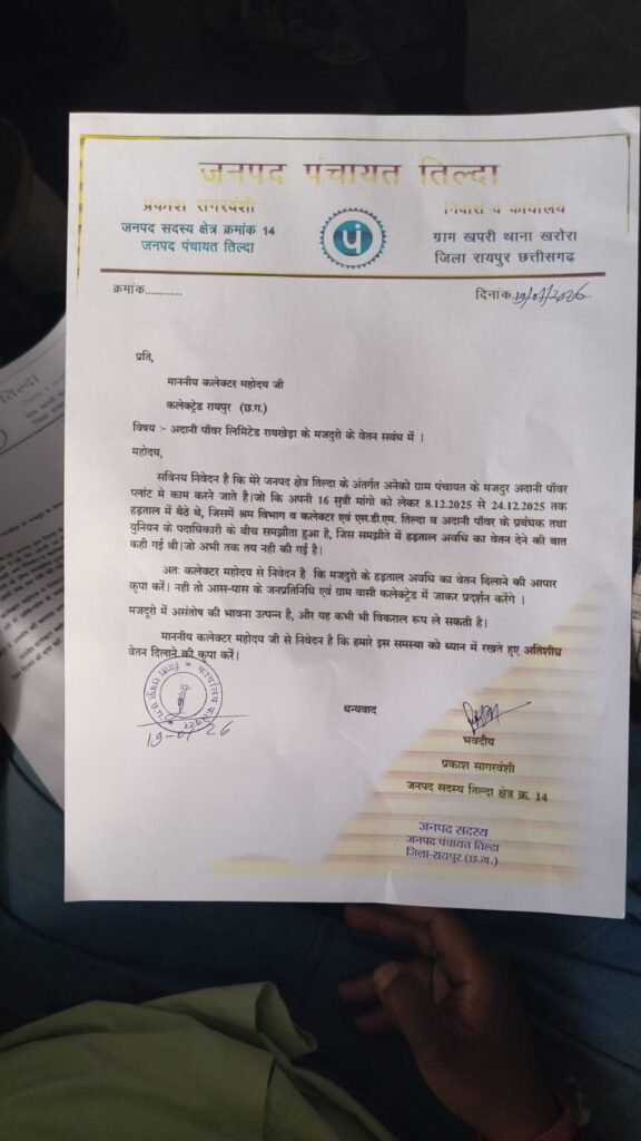 जनपद क्षेत्र तिल्दा के अंतर्गत अनेकों ग्राम पंचायत के मजदुर अदानी पॉवर प्लांट में काम करने जाते है। जो कि अपनी 16 सूत्री मांगो को लेकर 8.12.2025 से 24.12.2025 तक हड़ताल में बैठे थे, जिसमें श्रम विभाग व कलेक्टर एवं एस.डी.एम. तिल्दा व अदानी पॉवर के प्रबंधक तथा युनियन के पदाधिकारीयों के बीच समझौता हुआ है, जिस समझौते में हड़ताल अवधि का वेतन देने की बात कही गई थी। जो अभी तक तय नहीं की गई है। अगर कलेक्टर एवं एस डी एम द्वारा श्रमिकों का वेतन नहीं दिया गया तो आस-पास के जनप्रतिनिधि एवं ग्राम वासी कलेक्ट्रेट रायपुर में जाकर प्रदर्शन करेंगे ।