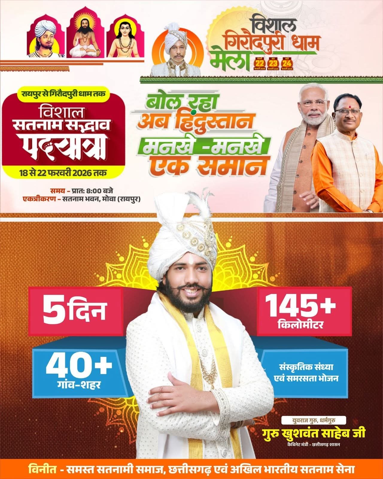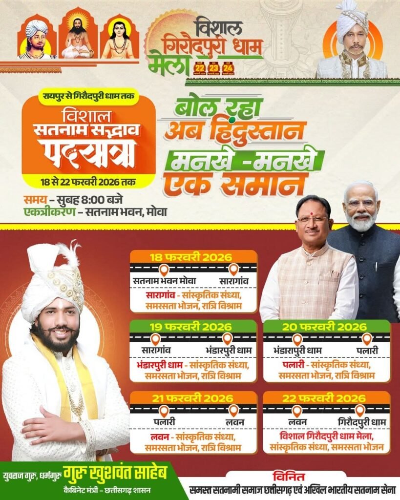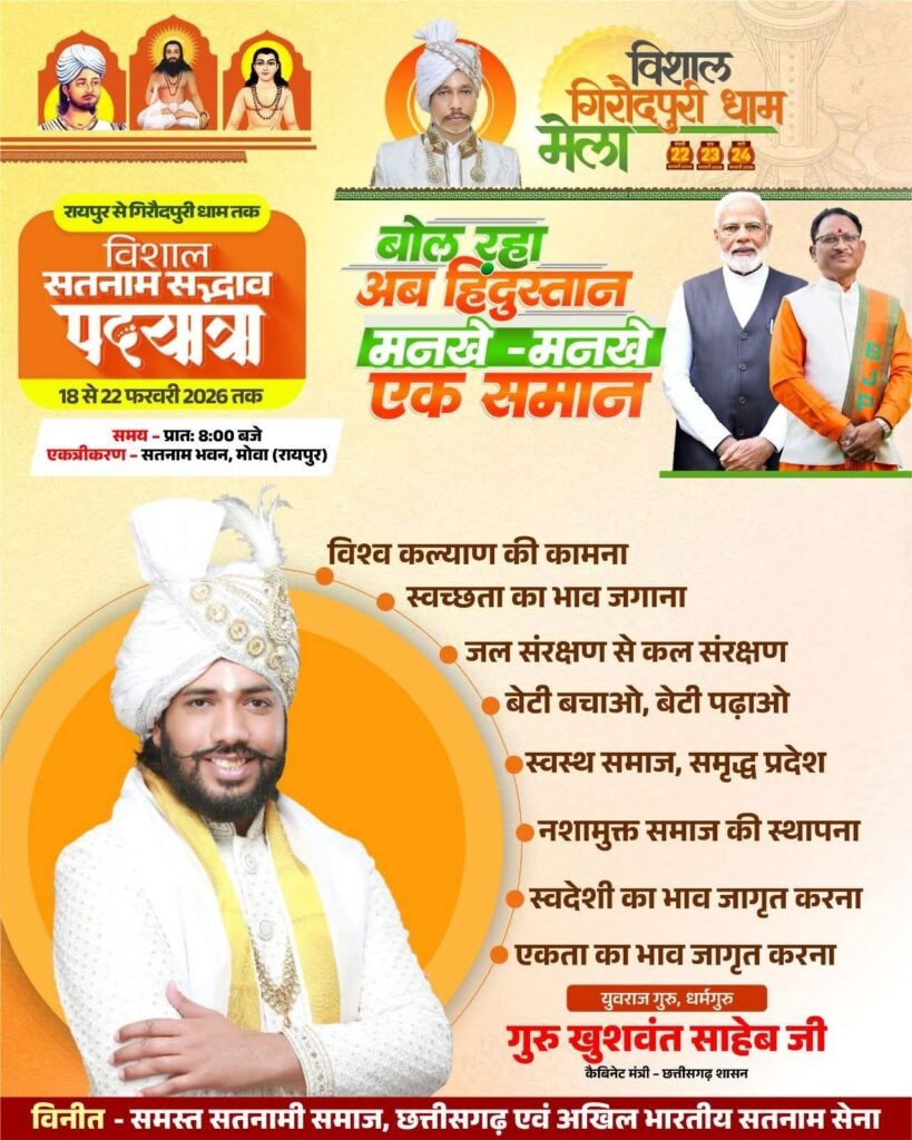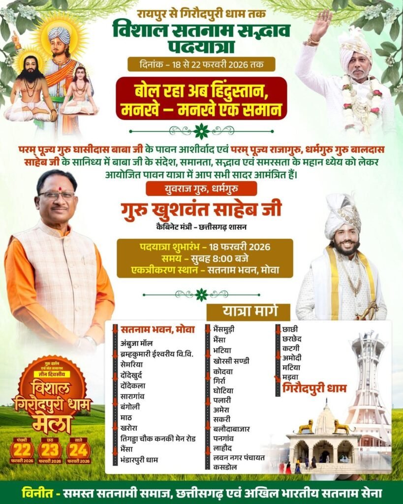 रायपुर, छत्तीसगढ़। सतनामी समाज की आस्था, एकता और सामाजिक समरसता के पावन उद्देश्य को लेकर राजधानी रायपुर से पवित्र गिरौदपुरी धाम तक 18 से 22 फरवरी 2026 के बीच “विशाल सतनाम सद्भाव पदयात्रा” का आयोजन किया जा रहा है। यह पदयात्रा “बोल रहा अब हिंदुस्तान, मनखे–मनखे एक समान” के मूल संदेश के साथ समाज में भाईचारा, समानता और मानवता के मूल्यों को सुदृढ़ करने का संकल्प लेकर आगे बढ़ेगी।